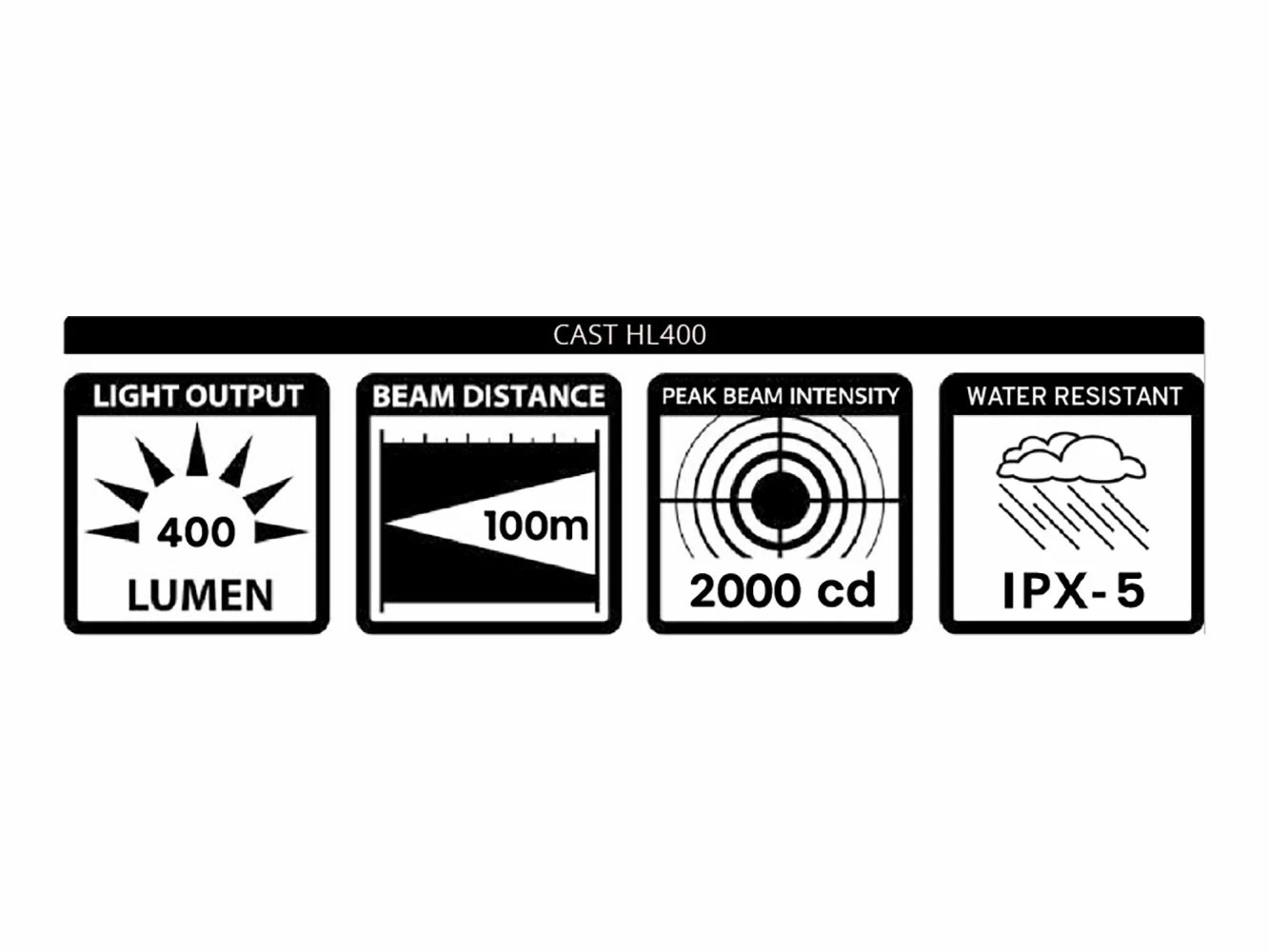 - Les éclairages Cast peuvent éclairer de 5 manières différentes avec trois modes d’éclairage constant et deux modes de flash pour une utilisation et une durée de fonctionnement variables.