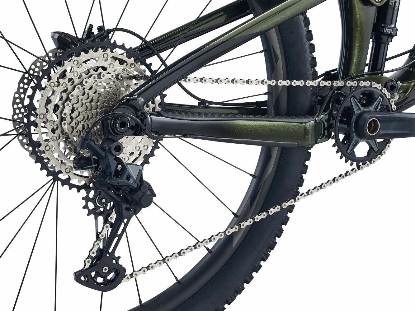 Le cadre en aluminium léger ALUXX SL dispose d’un reach rallongé pour plus de stabilité en terrain technique, et un tube de selle redressé pour renforcer l’efficacité au pédalage. La suspension arrière Maestro mise à jour offre un débattement des roues arrière de 120mm associé à une fourche de 130mm à l’avant.